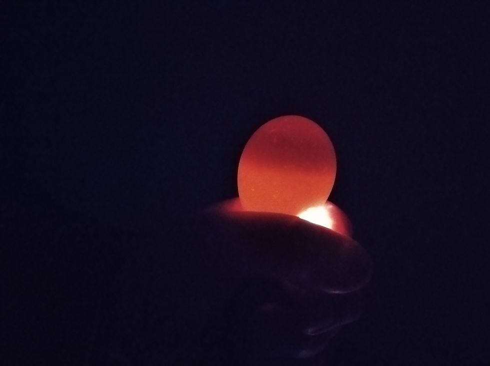 Os viables, nesta data xa deben ter a sua cámara de aire feita. Os miramos coa axuda do ovoscopio, neste caso unha linterna improvisada: